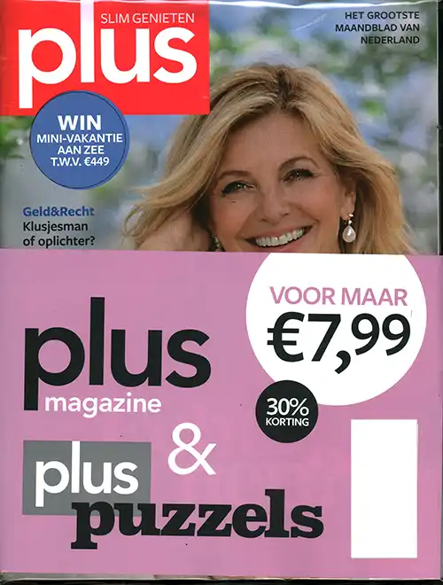 Plus Magazine: Plus Magazine is een maandelijks tijdschrift met ruim 200 pagina’s betrouwbare informatie over geldzaken en rechten, praktische tips om uw gezondheid op peil te houden, verhelderende artikelen over mens en samenleving, inspirerende ideeën voor huis en tuin en boeiende reisreportages Plus Puzzels: Plus Puzzels steekt met kop en schouders boven alle andere puzzelbladen uit. Elk nummer bevat meer dan 120 puzzels, voor de beginners en gevorderden. Bovendien is het magazine lekker groot (21 x 27 cm!) met volop ruimte om de puzzels in te vullen. Achterin staan de oplossingen. En u kunt prachtige prijzen winnen. Dit is het puzzelblad dat u niet wilt missen. Heerlijk voor thuis, om mee te nemen én om cadeau te geven