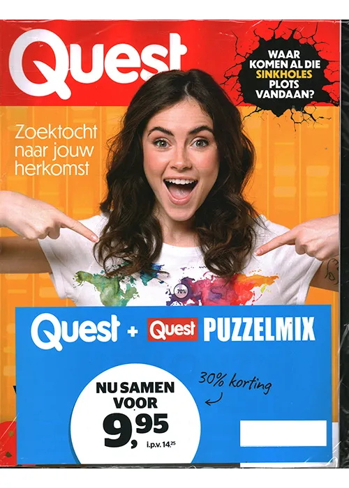 In Quest vind je elke maand een spannende mix van kennis en plezier. We noemen het braintainment. Je krijgt antwoord op fascinerende, verrassende vragen over psychologie, gezondheid, voeding, natuur, wetenschap, techniek, sport en reizen. De Quest Puzzelmix biedt je elk kwartaal een lekkere mix van breinbrekers om je hersens aan te scherpen. Los de unieke beeldpuzzels op, maak de cryptogrammen en logikwissen, speel zeeslag, kraak tectonics, cijfercodes en sudoku’s, test je kennis met Questquizzen en vul de Zweedse puzzels, kruiswoorden en filippines in. En dan zwijgen we nog over de cryptoslangen, lijnpuzzels, woordrijgers, portrait codes… Met 100 pagina’s gevarieerd puzzelplezier ben je uren zoet.