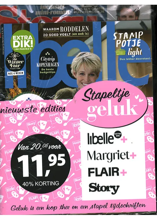 Geluk is een kop thee en een stapel tijdschriften. In dit tijdschriften pakket Stapeltje Geluk krijg je de nieuwste edities van de Libelle, Margriet, Flair & Story. Deze 4 nu allemaal in 1 pakket met een flink voordeel.