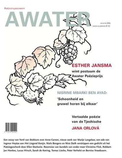 In het winternummer van Awater een interview door debutant Myriem El-Kaddouri met haar voorbeeld, de nieuwe Dichter der Nederlanden Nisrine Mbarki Ben Ayad. Esther Jansma wint postuum de Awater Poëzieprijs. Ingmar Heytze screef een ode aan ‘Het Liegend Konijn’. Nico Stolk en Niels Bongers verstrippen Ellen Deckwitz. En recensies van bundels van onder meer Sara de Koning, Jeroen van Kan, Maxime Garcia Diaz, Tomas Lieske, Peter Verhelst en Lucas Hirsch. En natuurlijk de Awater Top 6, de PoëzieTop 15, de lijst met nieuw verschenen titels, de Poëzie-agenda en de Poëzieclubkeuze: deze keer Els Moors met Voer voor struikrovers.
