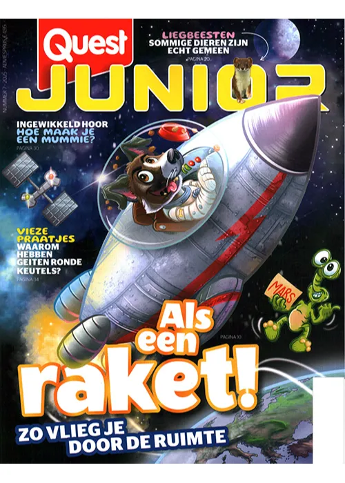 Quest Junior is hét tijdschrift voor nieuwsgierige jongens en meisjes van 7 tot 12 jaar. In Quest Junior gaat het net als in Quest over ons lichaam, natuur, techniek, geschiedenis, psychologie, maar dan gemaakt voor kinderen. Het magazine staat daarom vol leerzame strips, bijzondere foto’s, fijne doordenkers en gekke wetenswaardigheden. Ook laat experimenteerexpert Boy, in het dagelijks leven leraar biologie, elke maand zijn leukste proefjes zien. Quest Junior is de beste keuze voor elk kind met 44 pagina’s leuk en intelligent vermaak en gegarandeerd gespreksstof voor het hele gezin!