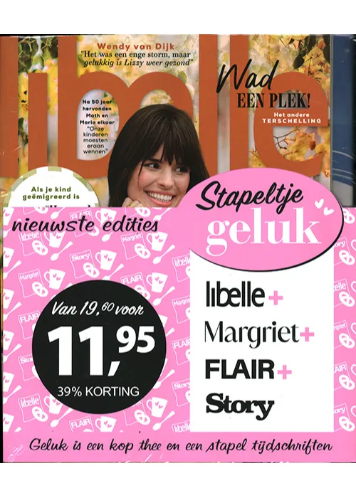 Geluk is een kop thee en een stapel tijdschriften. In dit tijdschriften pakket Stapeltje Geluk krijg je de nieuwste edities van de Libelle, Margriet, Flair & Story. Deze 4 nu allemaal in 1 pakket met een flink voordeel.