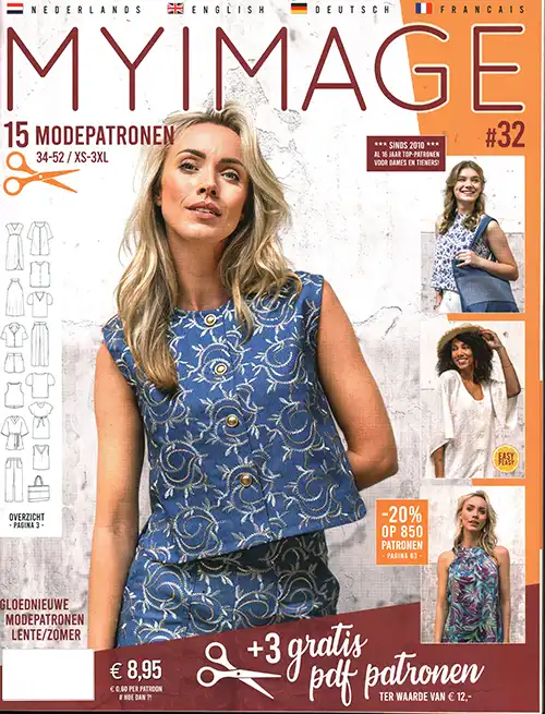 My Image is een modern modeblad. Er staan leuke modellen in voor jongvolwassenen en volwassenen. In dit blad staan 18 patronen in om over te nemen, waarvan 2 pdf patronen om gratis te downloaden met de kortingscode achter in het boek. Een pdf patroon moet op de computer gedownload worden. Het raderblad van dit blad is erg overzichtelijk. Het raderblad in het boek dien je zelf te overnemen op patroonpapier. De maten die erin staan zijn maat 34-52 / XS-XXXL