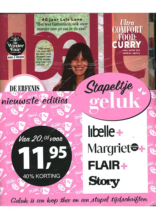 Geluk is een kop thee en een stapel tijdschriften. In dit tijdschriften pakket Stapeltje Geluk krijg je de nieuwste edities van de Libelle, Margriet, Flair & Story. Deze 4 nu allemaal in 1 pakket met een flink voordeel.
